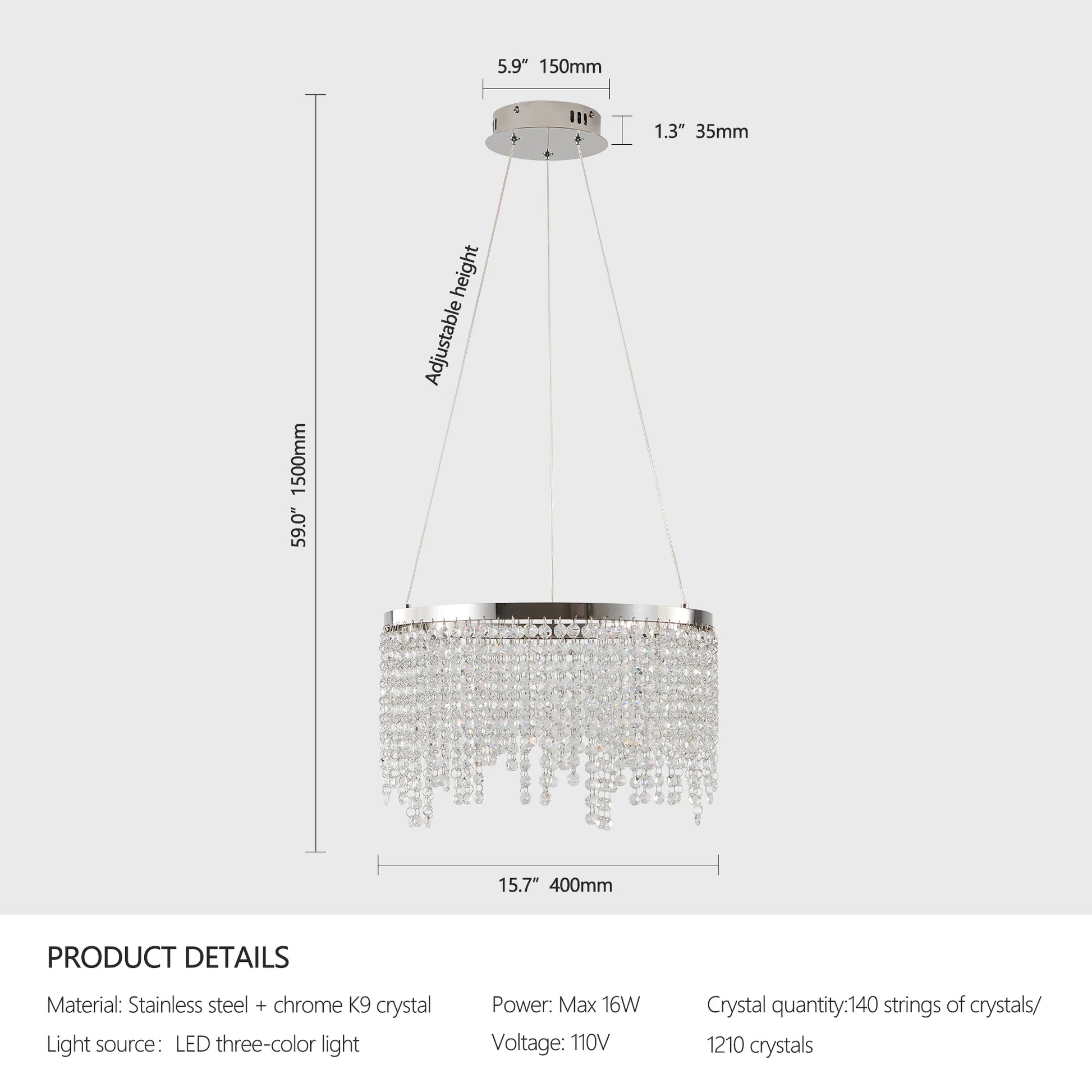 15.7inch luxury crystal led chandelier - dimmable - adjustable height and color temperature (3000k-6000k) - modern chandelier for living room, dining room and bedroom